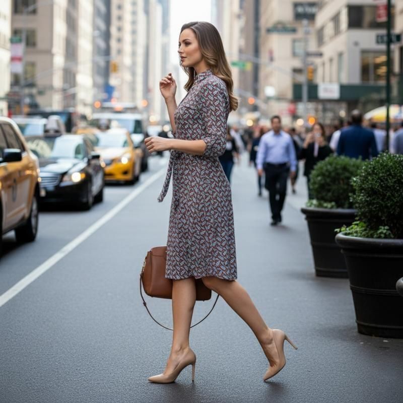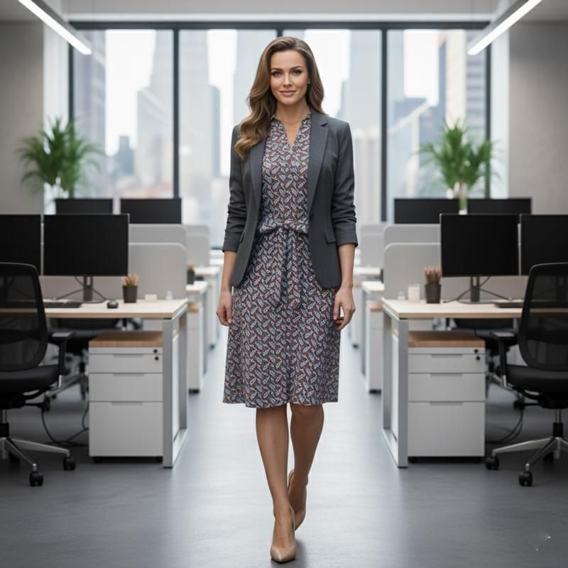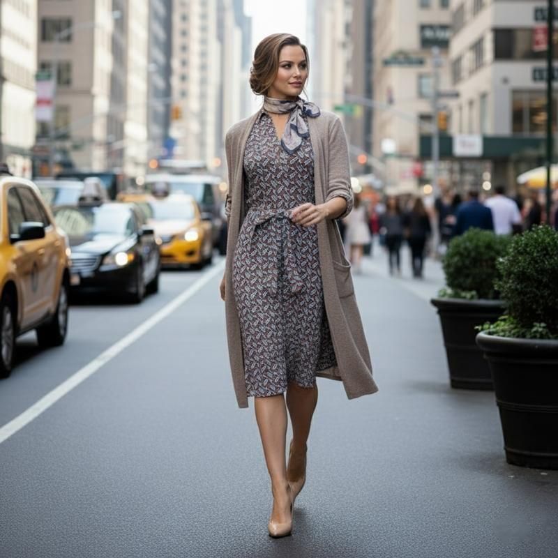 通勤や打ち合わせ、きちんと見せたい外出まで幅広く。羽織は オフ白/エクリュ/ライトグレー/サンドベージュの明るいニュアンスが好相性 (ネイビーよりも軽さが出て柄が映えます)。赤を拾うならテラコッタ系の小物、 ブルーを活かすならアイシーグレーのバッグが上品です。旅行・出張にも便利。