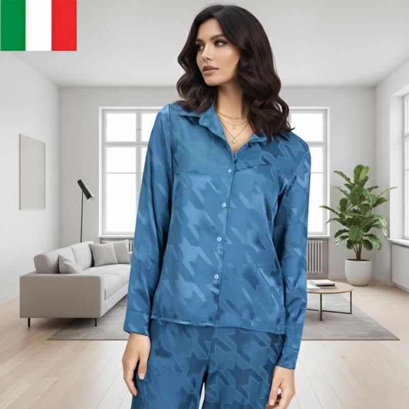 イタリア製 -光沢が美しいダックブルーの千鳥格子柄。イタリアンサテンの滑らかな肌触りと端正なシルエット。ビジネスから華やかな席まで、セットアップもおすすめ。