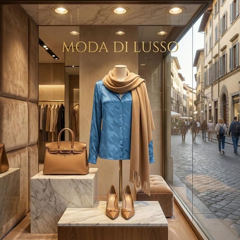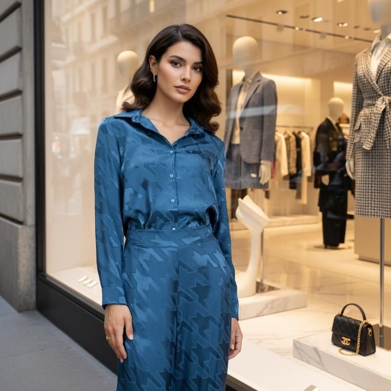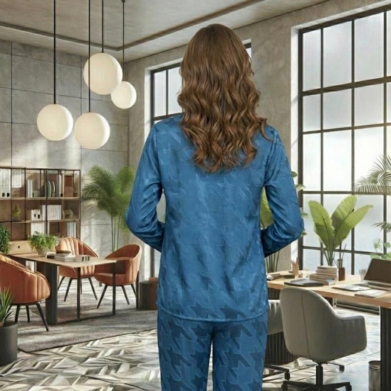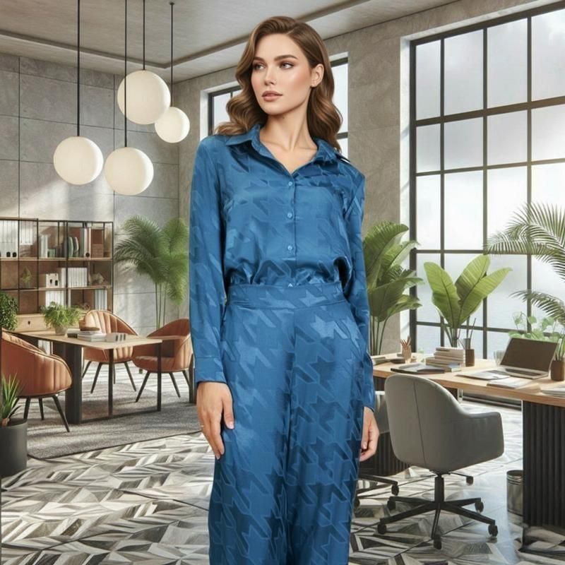 深みのあるダックブルーに浮かぶ、トーン・オン・トーンの千鳥格子柄。優美なドレープと滑らかなサテンの質感が、自信に満ちた美しい所作を導きます。 <朝のビジネスミーティングから、夕暮れの華やかな会食まで。知性と品格を纏う一日。>