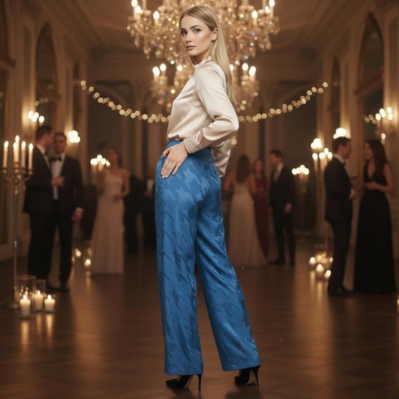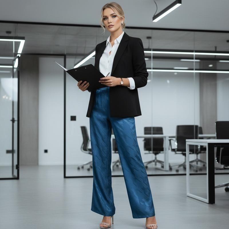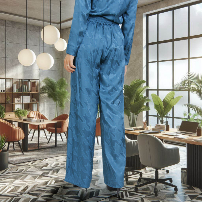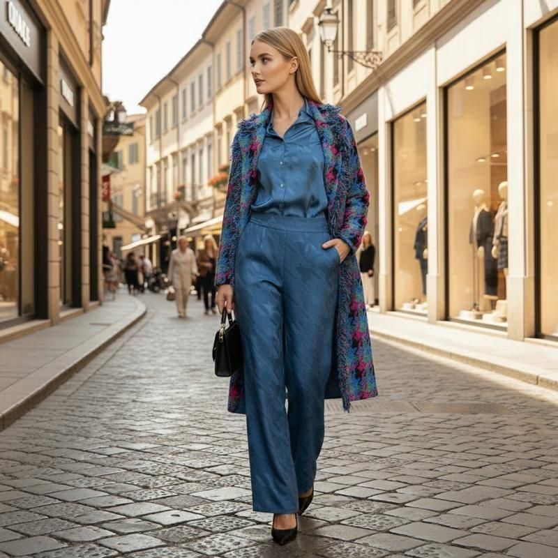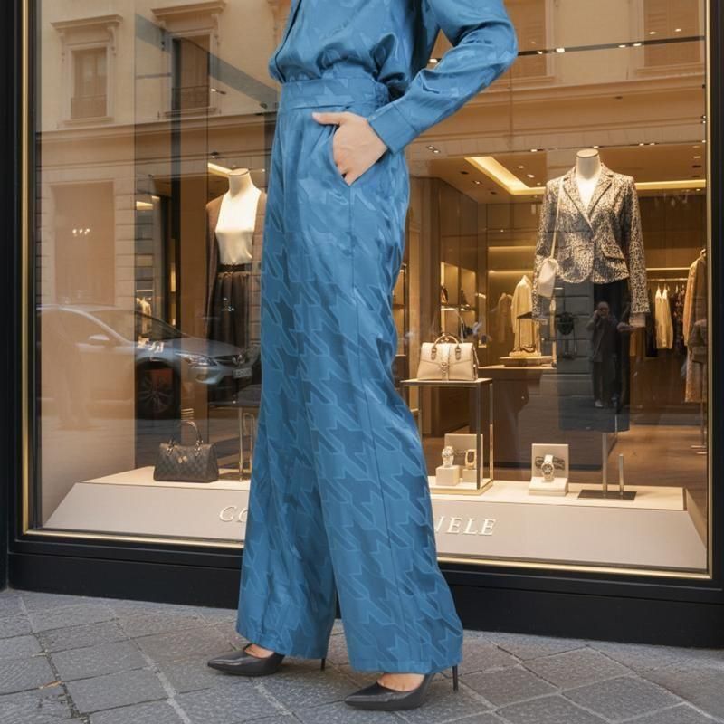 深いダックブルーに光が溶け込むような上品なサテン。縦をすっきり見せるセミワイドととろみの生地感で一日中快適。通勤にもお出かけにも頼れるイタリア製のオールシーズンパンツです