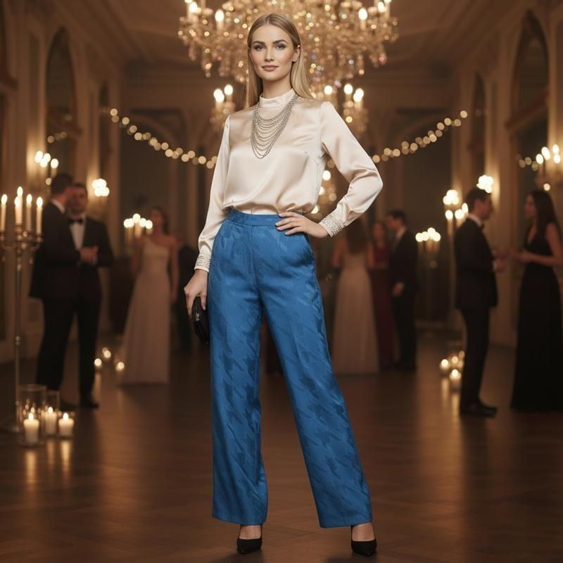 <夕方の外出にも柔らかな光沢が落ち着きを添えます>