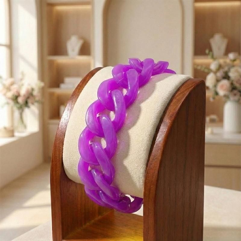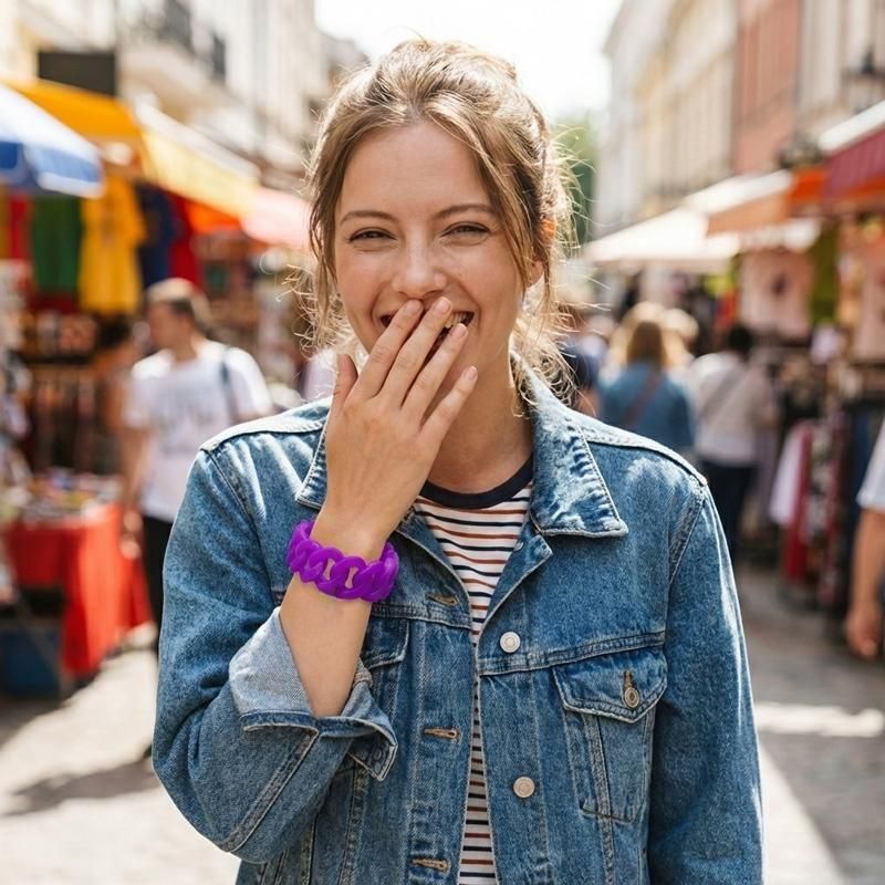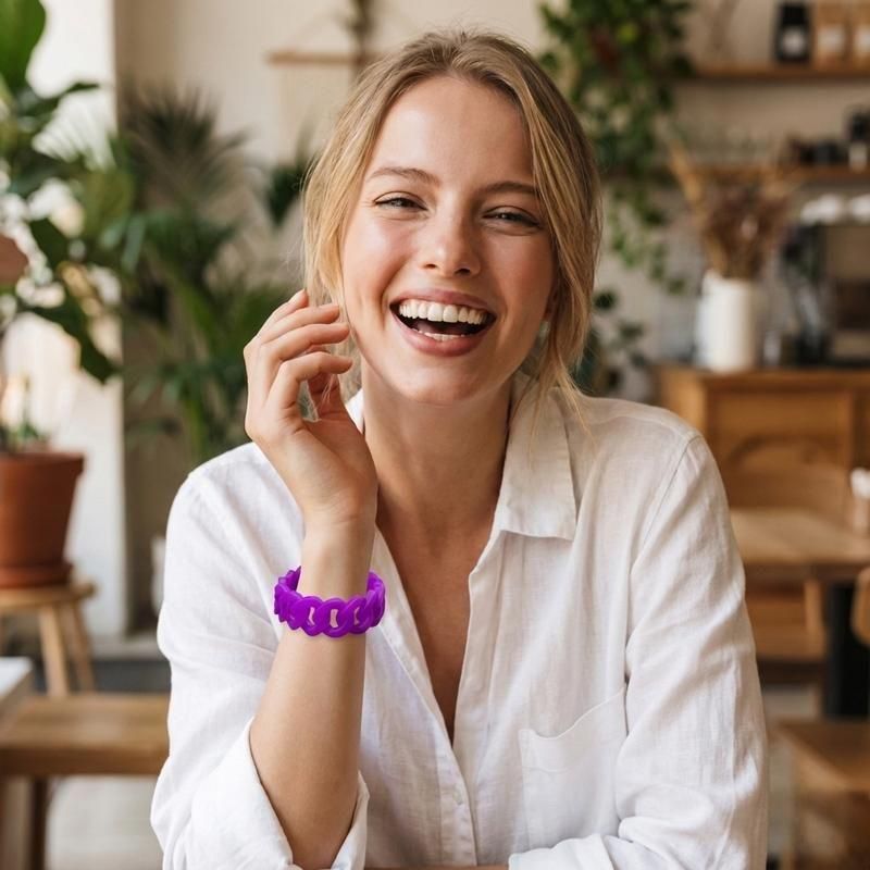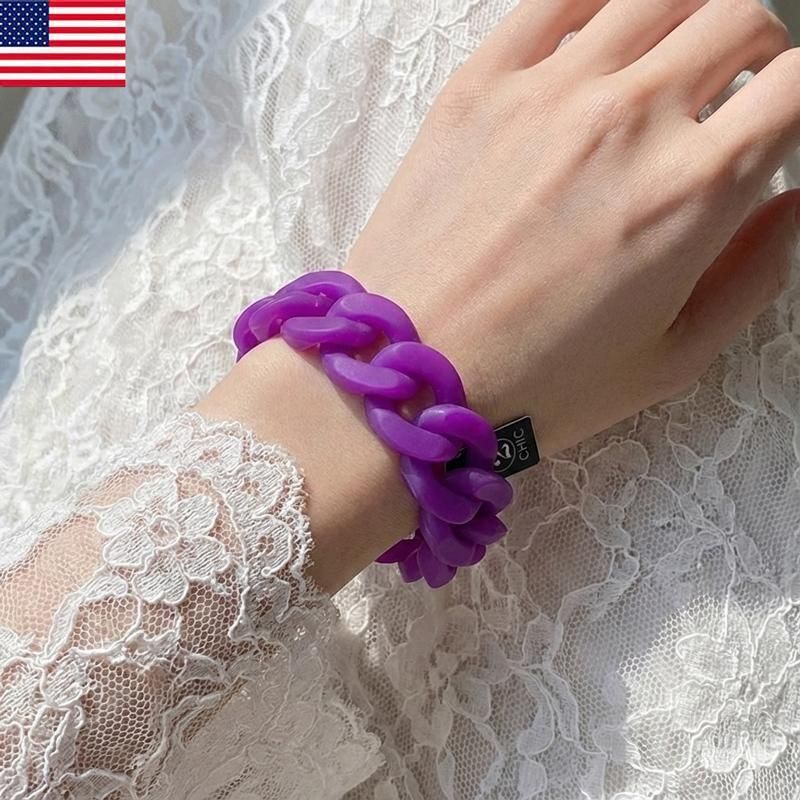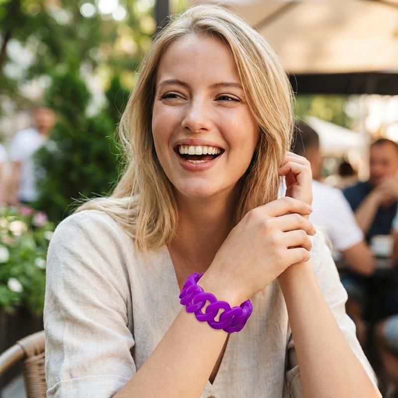 「透け感×チェーンデザイン」が大人可愛いシリコンブレスレット。汗や水に強く、驚くほど軽い着け心地が魅力です。光を透かすクリアなパープルが肌を美しく見せ、オールシーズン手元のアクセントとして活躍します。