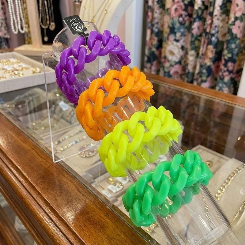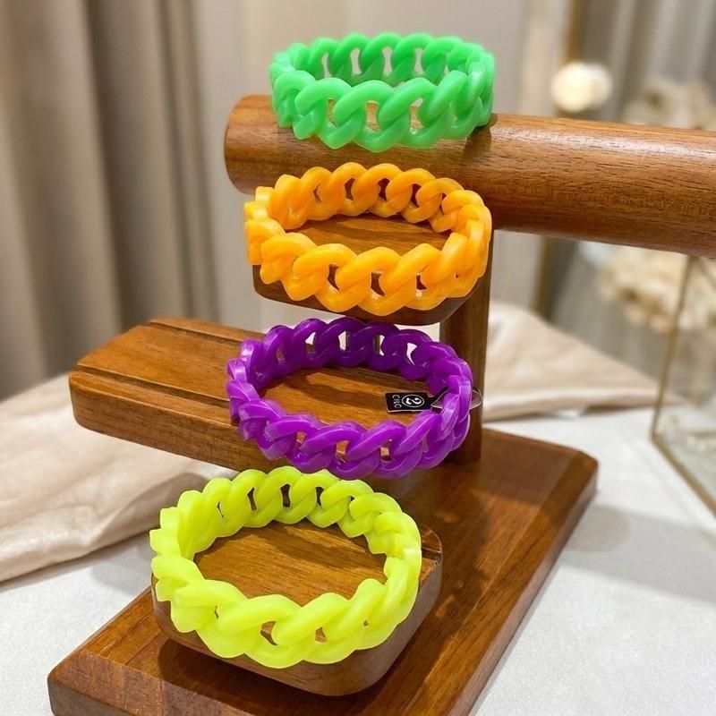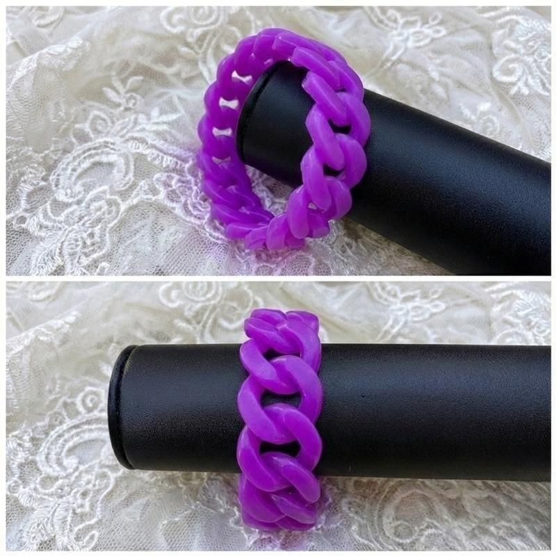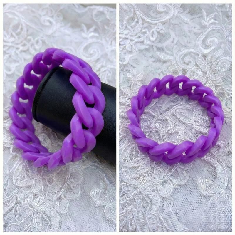 透け感パープルのチェーン風バングル。肌を美しく見せる半透明な質感と、シリコンならではのしっとりしたフィット感で快適なつけ心地。立体的なフォルムが手元を華奢に見えるのが魅力。