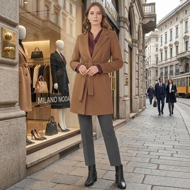 深みのあるキャメルのミドル丈。滑らかなストレッチエコスエードと上品な光沢感で快適。テーラード襟とウエストベルトがメリハリとスタイルアップを後押し。オンオフ問わずロングシーズン重宝します。