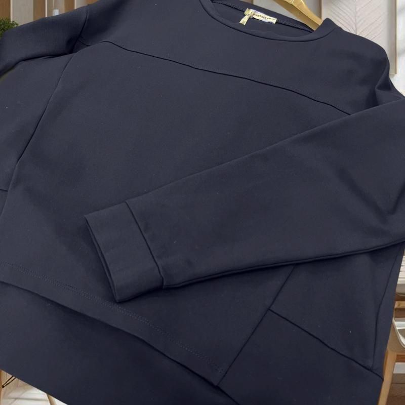 深みのあるネイビーの前後差シルエット。肉厚で滑らかなミラノリブの表情とストレッチ性で快適。斜めの切り替えラインがすっきり見せを後押し。オンオフ問わずロングシーズン重宝します。