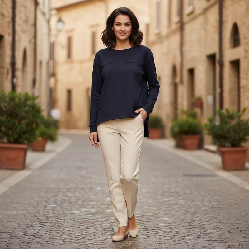 上品なネイビーの落ち着き。計算された斜めのラインと肉厚なミラノリブが、メリハリのある美しいシルエットを叶えます。 <忙しい朝も、袖を通すだけで洗練されたスタイルが完成します>