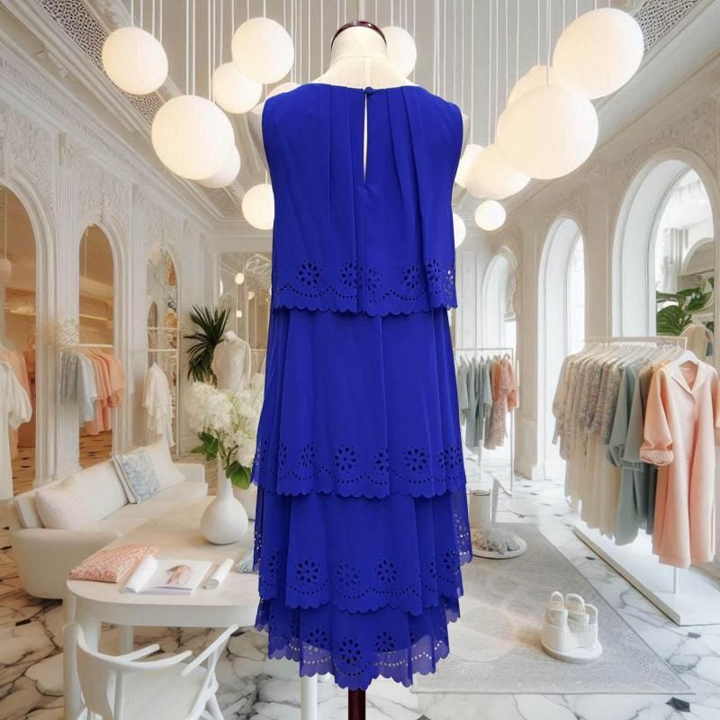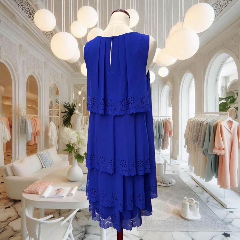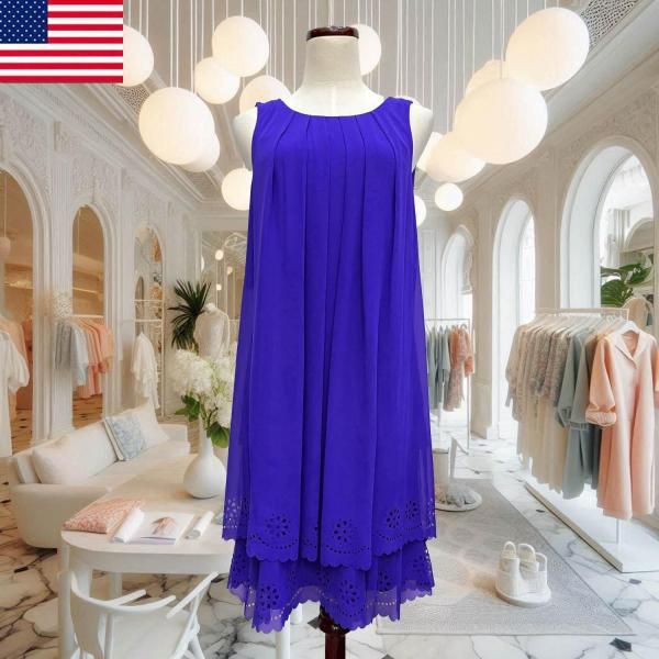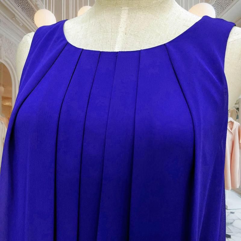NY直輸入|Jessica Simpson/ロイヤルブルーのシフォン ノースリーブワンピース。前後プリーツとカットワーク裾が上品に揺れ、総裏地で安心。インポート服として通年の行事や食事会に。