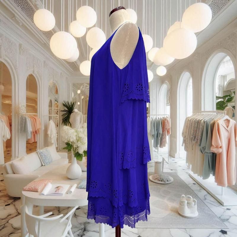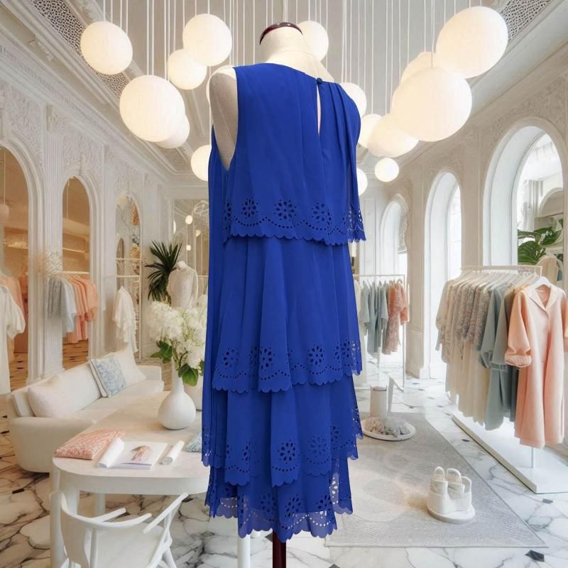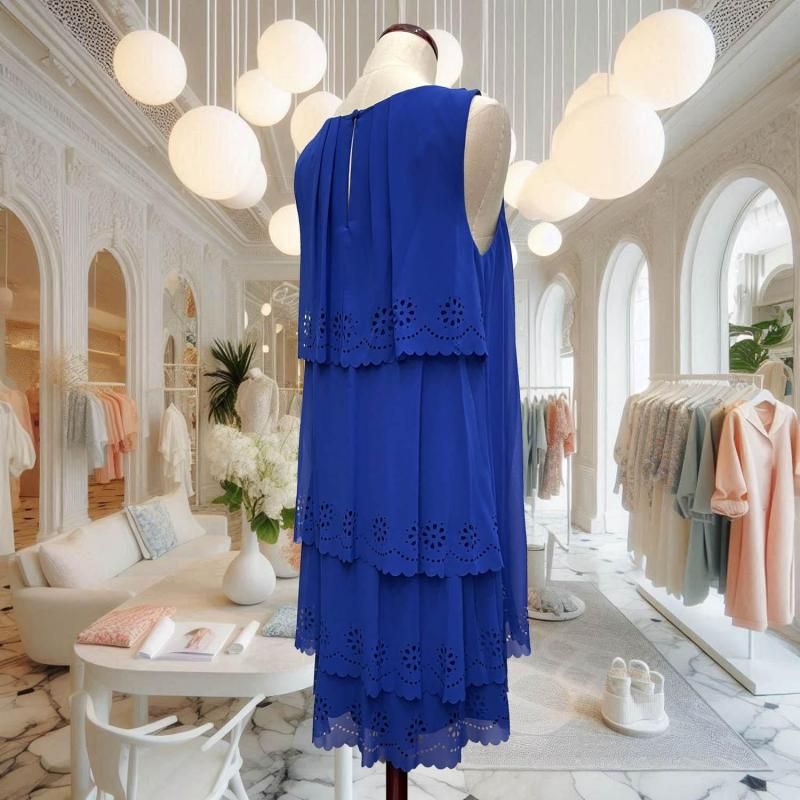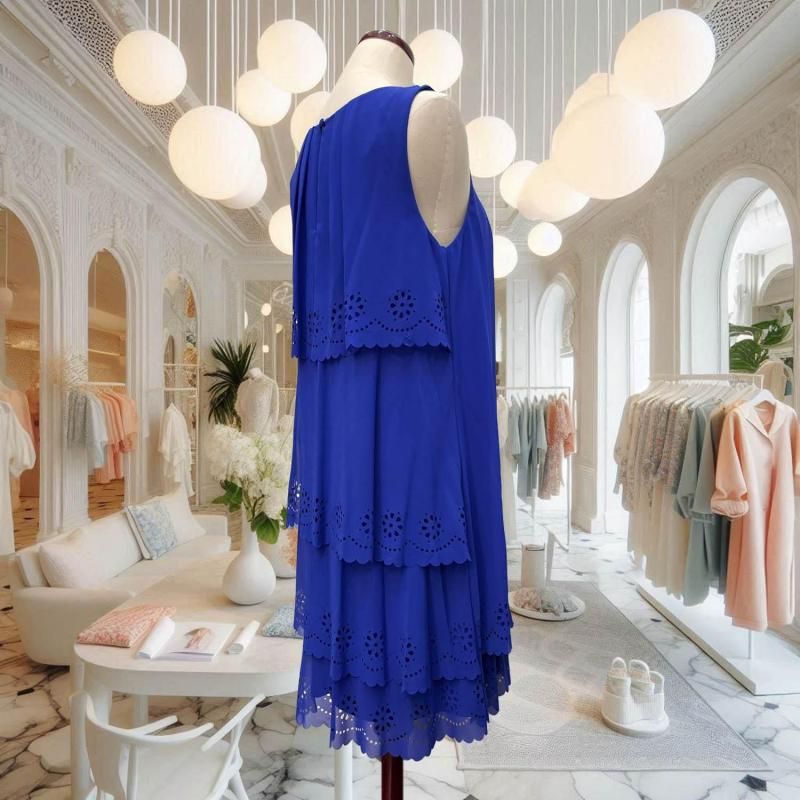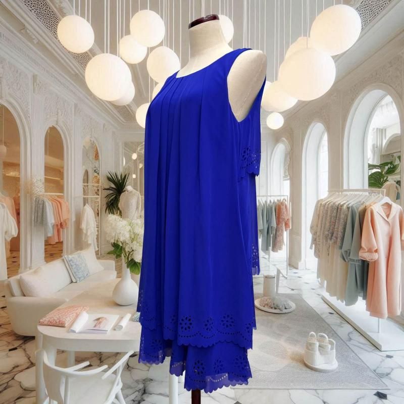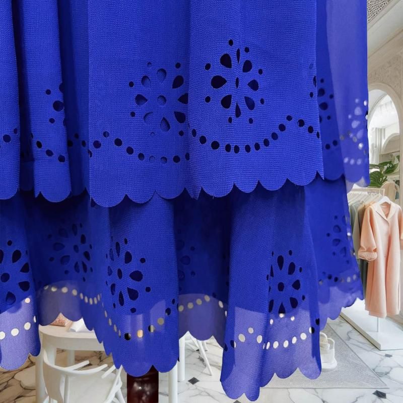 深いロイヤルブルーを軽やかに。揺れるプリーツとカットワークが涼やかな奥行きをつくる。