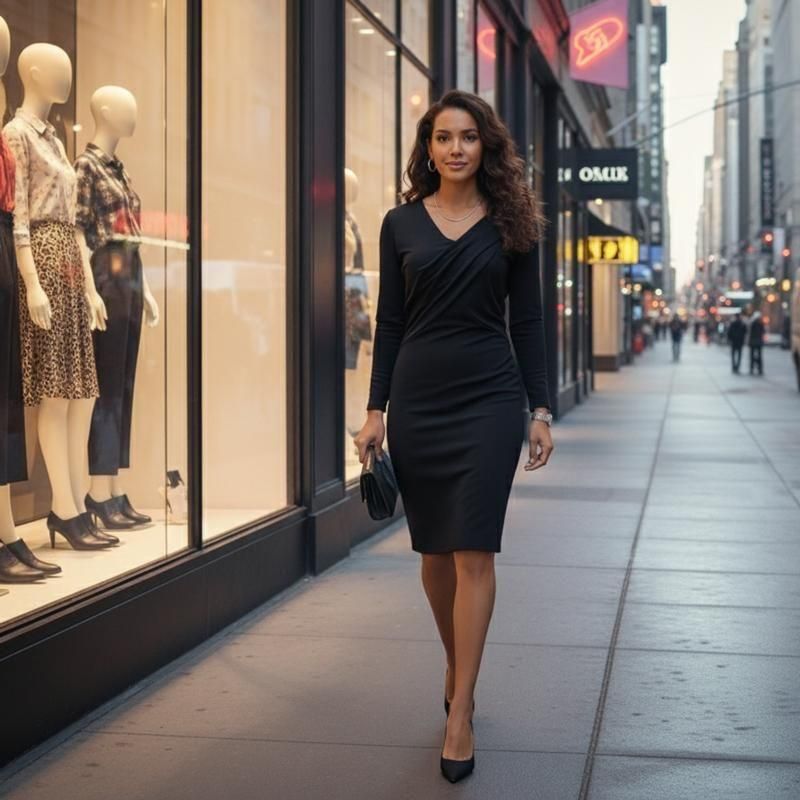 Vネックに寄り添うアシンメトリードレープ。肩線をわずかに落としたドロップショルダーが肩先をやわらかく見せ、ウエストへ向かう斜めの切り替えが視線を下方向へ流して全身バランスをすっきり整えます。身体に沿いながらも自立するシースラインで、凛とした印象に。