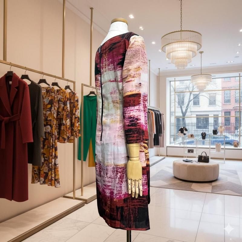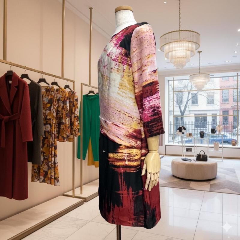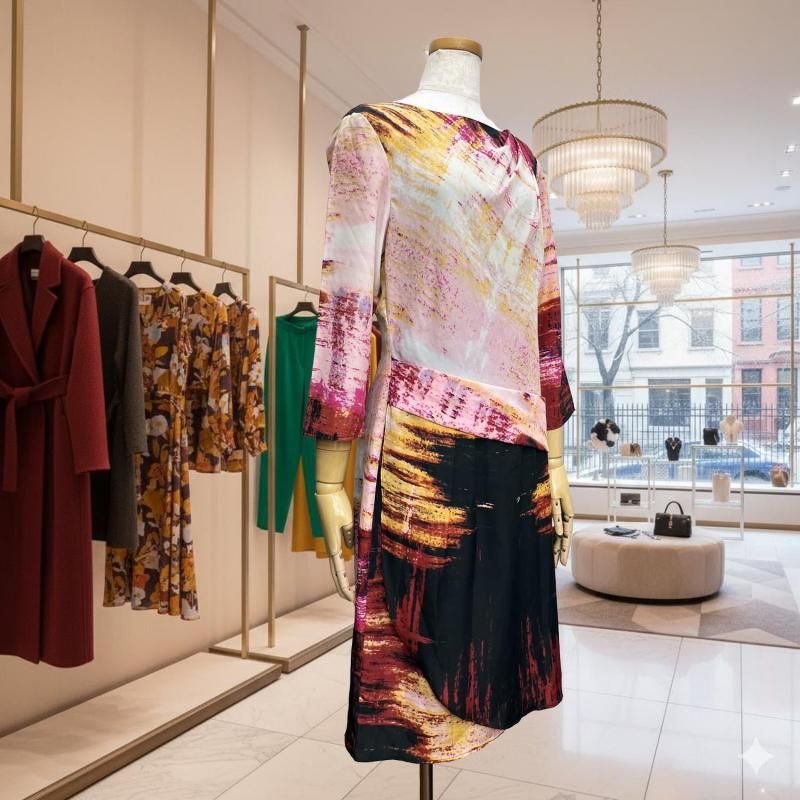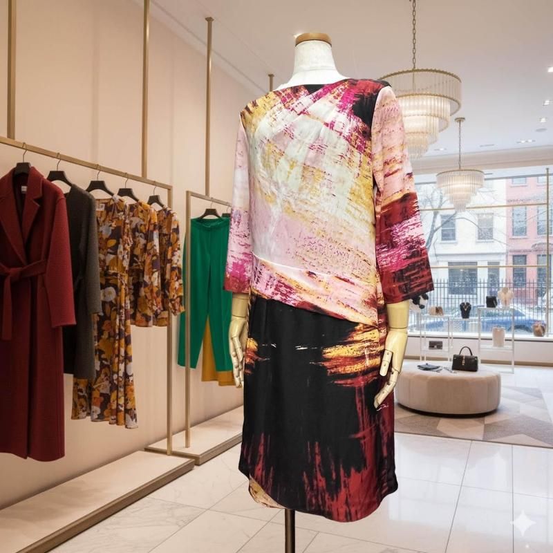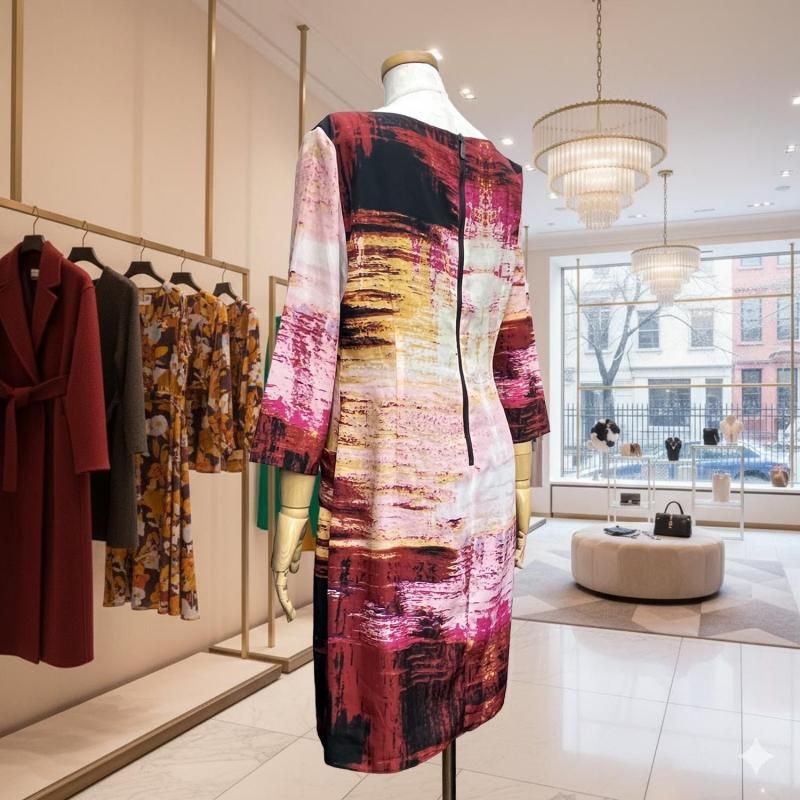 LA直輸入/ピンク×ブラックの幾何プリント。とろみストレッチのストレートワンピース。春・秋・冬の3シーズン快適、衿・袖は見返しで端正、後ろループ。通勤から旅の夕暮れまで一枚で映える。
