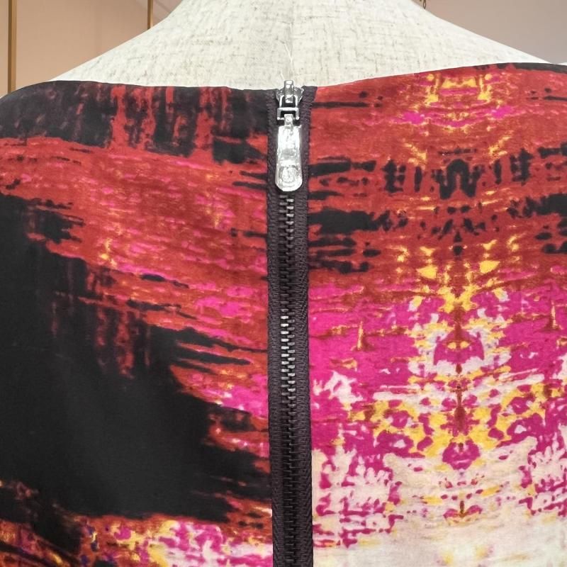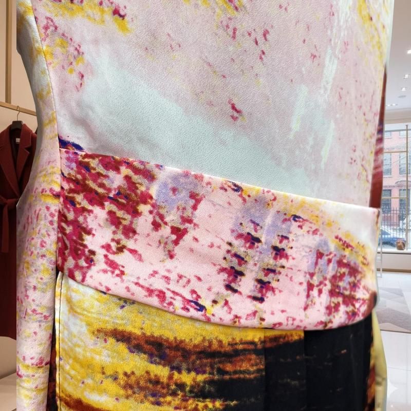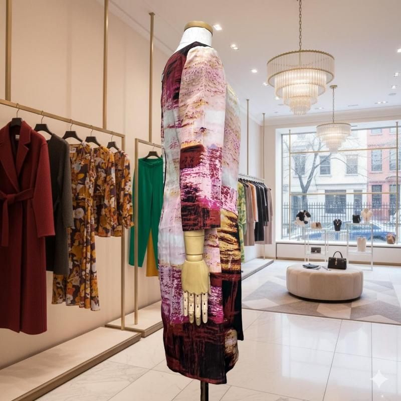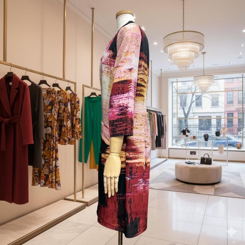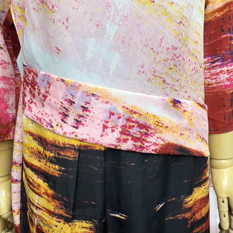 LA直輸入/ピンク×ブラックの幾何プリント。とろみストレッチのストレートワンピース。春・秋・冬の3シーズン快適、衿・袖は見返しで端正、後ろループ。通勤から旅の夕暮れまで一枚で映える。