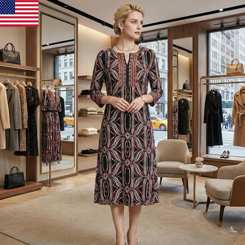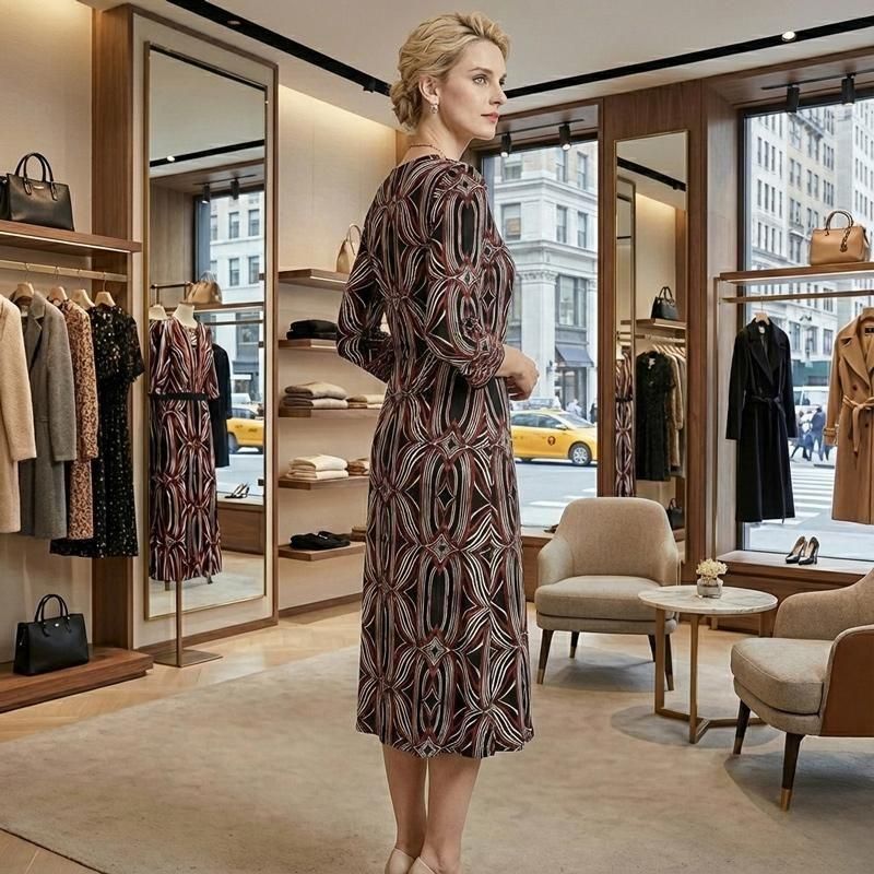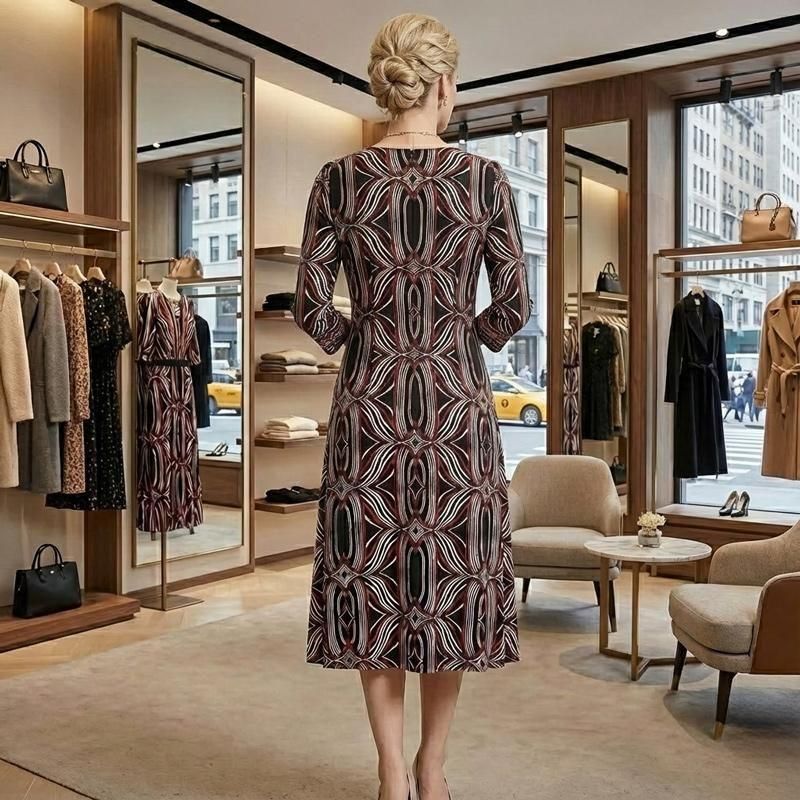 ブラックベースに描かれた幾何学ライン。縦のラインと滑らかなストレッチ素材が、メリハリのある美しいシルエットへ導きます。 <忙しい朝も一枚で決まる頼れる存在です>