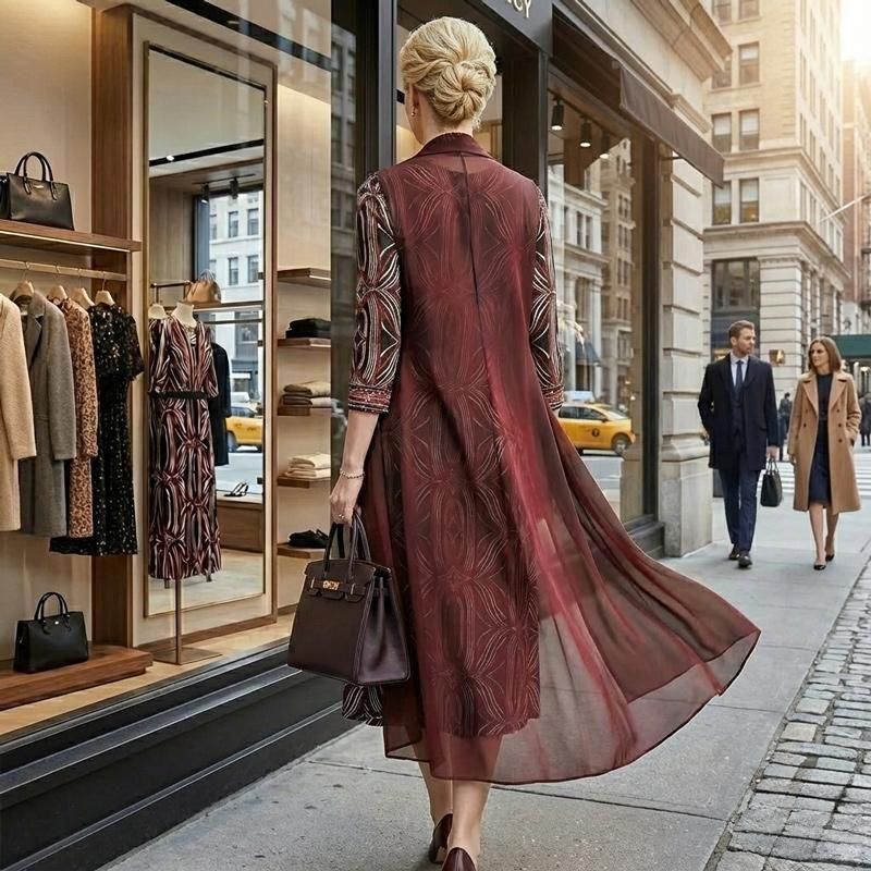 色合わせ:黒/ボルドー、ゴールドのアクセサリーで華やかに。