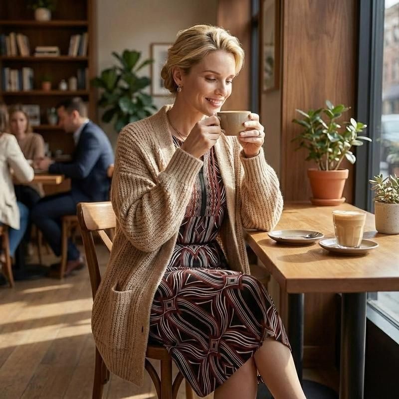 週末:フラットシューズやカーディガンで、自宅でのリラックスタイムや近所への外出に。