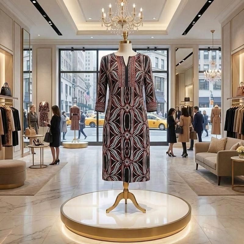 黒地に白とボルドーのラインが交差する、アールデコ調の幾何学柄。縦に流れるようなパターンが視線を誘導し、全体をすっきりと引き締まった印象に仕上げます。前中心と袖口には小さなゴールドのストーンをあしらい、控えめながらも上品な輝きをプラスしました。